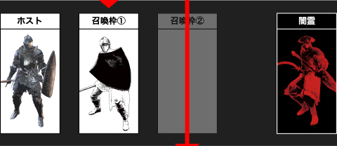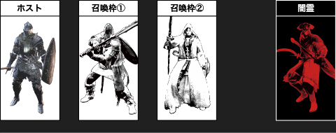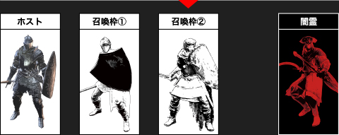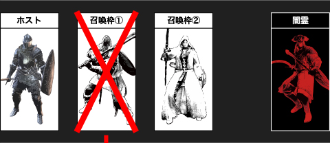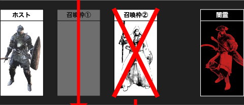 さらに闇霊が白霊を撃破 最初に撃破された召喚枠①の時間経過が完了していないため、召喚サインが表示されず、白霊を召喚できない状態となります |