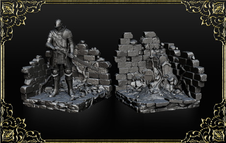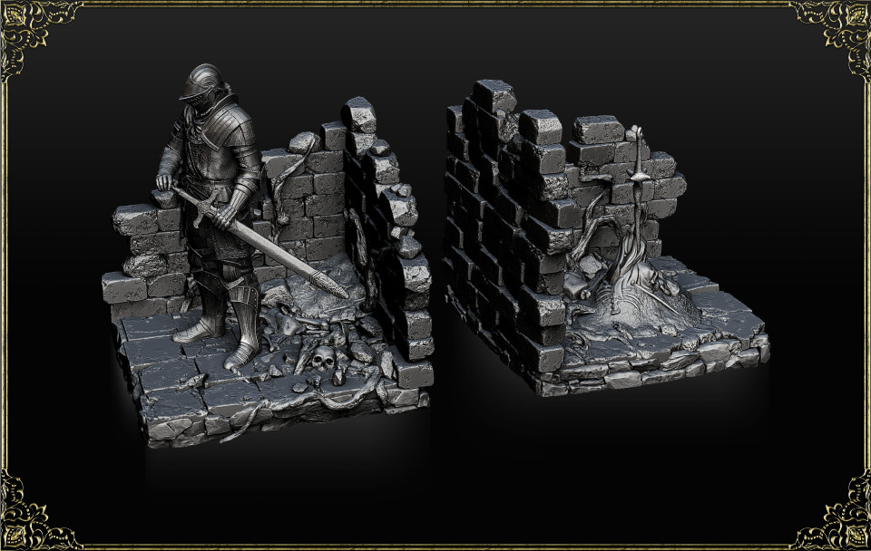 「DARK SOULS 」シリーズを象徴する「篝火」と上級騎士の特製ブックエンド。ブックエンドとしての使用はもちろん、ひとつのジオラマとしても楽しむことができます。
